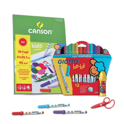 Confezione da 12 pennarelli lavabili, 1 stick Colla Giotto be-be', forbicine con punte arrotondate e 1 album da disegno Canson Kids