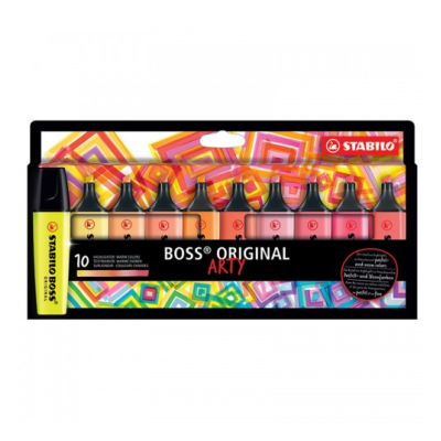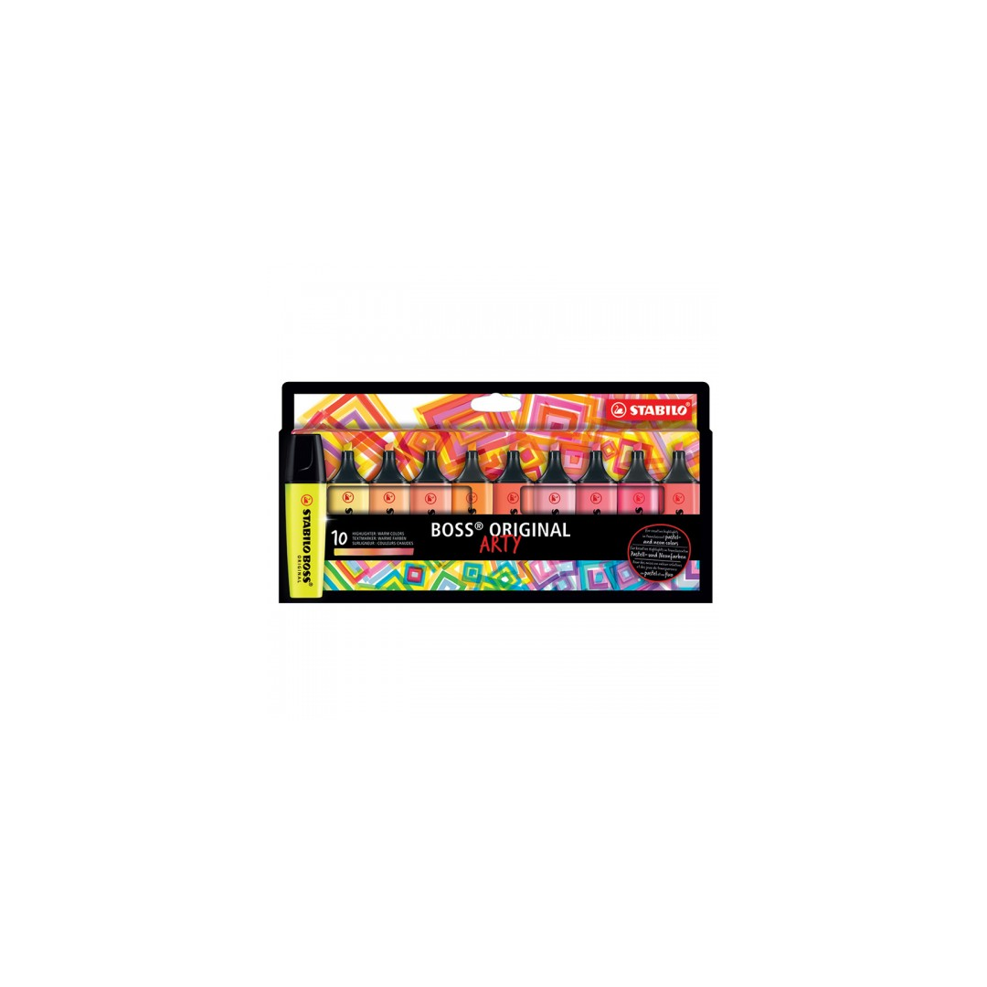 L'evidenziatore STABILO® BOSS® Original utilizza un affidabile inchiostro a base d'acqua con tecnologia Anti-Dry-Out che permette di non seccarsi per una durata di 4 ore senza cappuccio ed è adatto per quasi tutti i tipi i carta. Presenta una punta a scalpello che offre due spessori del tratto di 2 e 5 mm, in modo da poterlo usare per un'ampia gamma di attività, come scrivere, sottolineare o evidenziare. Gli evidenziatori STABILO® sono ideali per gli studenti e per i professionisti che devono leggere e contrassegnare informazioni importanti nei testi. Ogni evidenziatore presenta la classica forma BOSS® con fusto piatto per una presa salda. Disponibile in una pratica confezione che contiene 10 colori assortiti caldi (giallo, rosso, arancione, rosa, arancione papaya, rosa pesca, rosa antico, rosa corallo, giallo banana, fior di ciliegio).