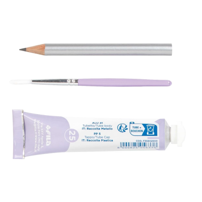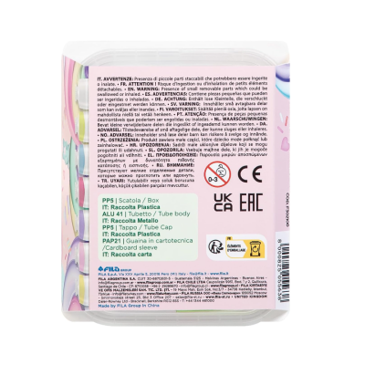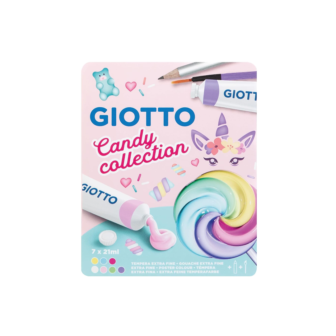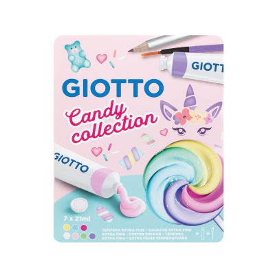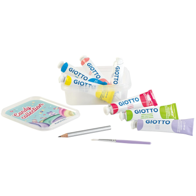 L'astuccio in plastica trasparente personalizzato Candy Collection contiene 7 tubi tempera 21ml in 6 colori candy + 1 bianco tra cui anche i