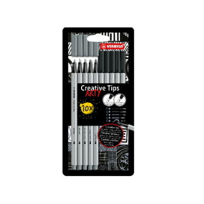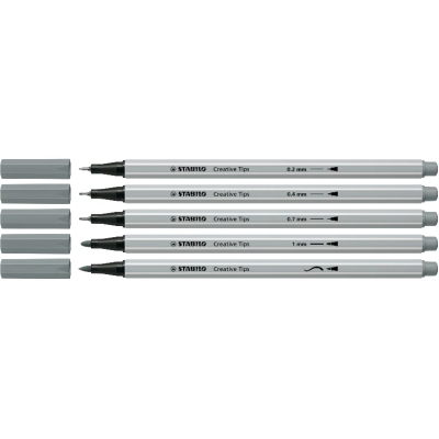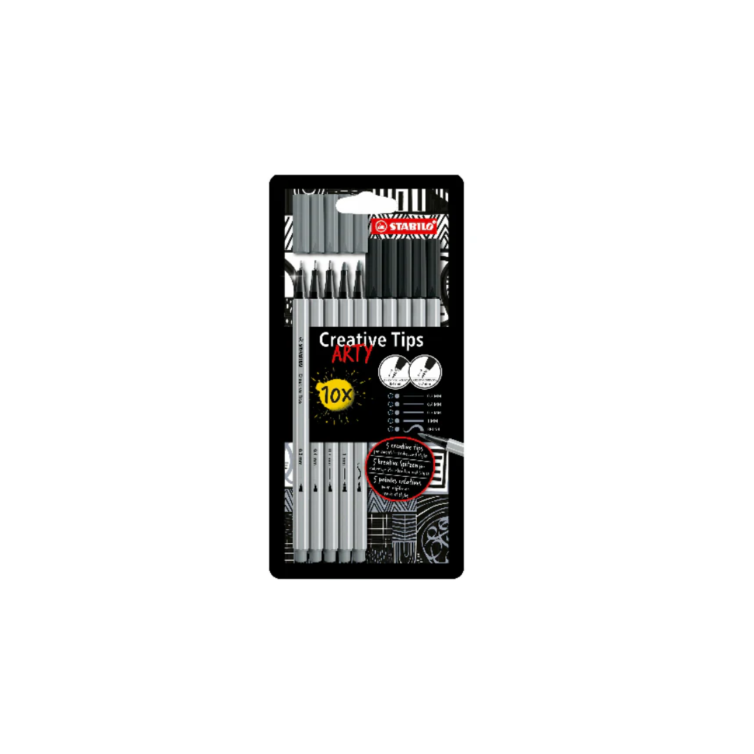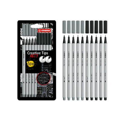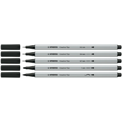 STABILO Creative Tips offre la perfetta varietà di penne per realizzare opere d'arte creative con facilità. Che tu voglia creare un'opera d'arte complessa utilizzando linee di diverso spessore o un'opera di hand lettering con una varietà di tratti, STABILO Creative Tips sono le penne perfette. Le diverse varianti di punta presenti nei set Creative Tips includono un fineliner extra-fine da 0,2 mm, due fineliner a molla con punte da 0,4 mm e 0,7 mm, una robusta punta in fibra da 1 mm e una punta a pennello flessibile. La selezione premium è disponibile in diversi set in varie combinazioni di colori, ognuno con tutte e cinque le punte in ogni colore del set. Inoltre, con l'inchiostro a base d'acqua, puoi facilmente creare splendidi effetti acquerello e sfumature di colore su carta.