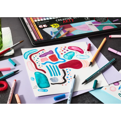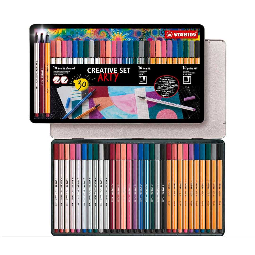 La scatola in metallo “Creative Set ARTY” include 10 penne fineliner STABILO point 88, 10 pennarelli con punta a pennello STABILO Pen 68 brush e 10 pennarelli STABILO Pen 68. Scoprili tutti nella scheda dettagli.