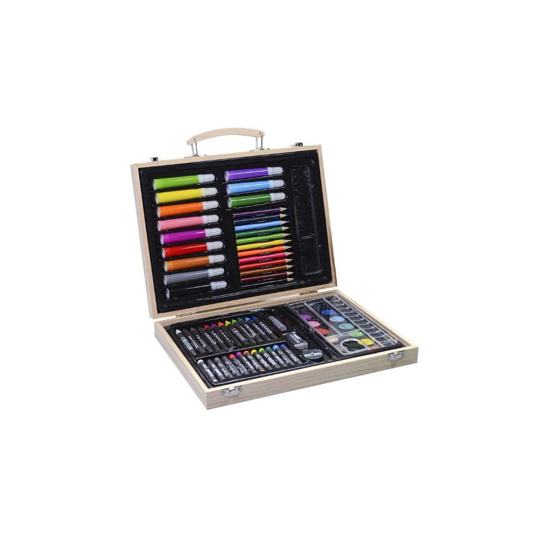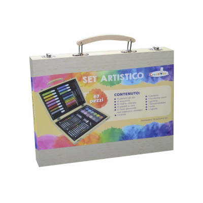 Valigetta Colori Per Bambini Set Artistico 67 Pezzi Contenuto della Valigetta: -12 pastelli ad olio -12 acquerelli -12 matite colorate -12 pastelli a cera -12 maxi pennarelli -1 matita -1 pennello -1 tavolozza colori -1 gomma -1 temperamatite -1 colla -1 righello