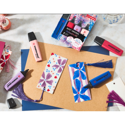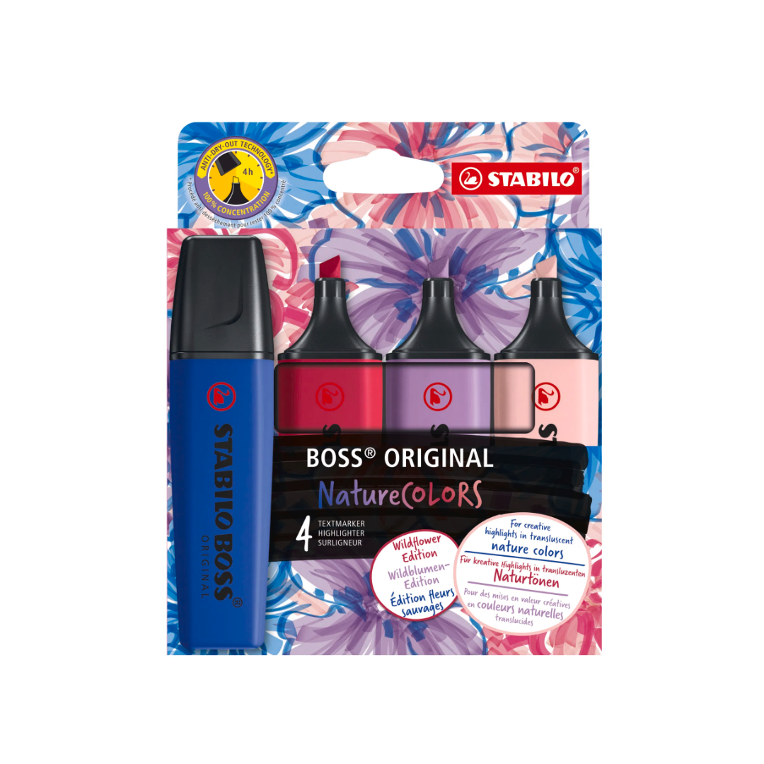 L'evidenziatore STABILO BOSS ORIGINAL NatureCOLORS Wildflower nell'astuccio con 4 colori: cipria (128), blu elettrico (132), giglio viola (162) e borgogna (250).