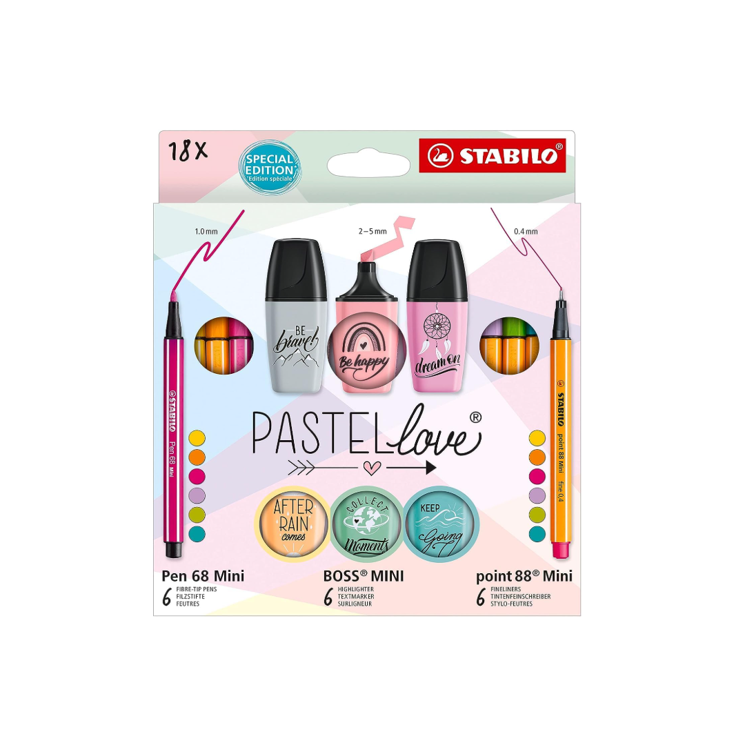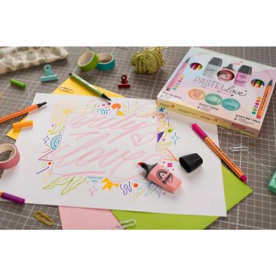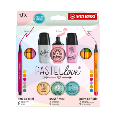 Buon umore e vibrazioni positive da regalare o da regalarsi per essere felici: il set STABILO Pastellove da 18, con il design realizzato da Hannah Rabenstein, farà sorridere chiunque. Gli STABILO Pastellove sets sono la scelta giusta per ogni occasione, e un'idea per stupire gli amanti dei colori pastello con un set regalo ancora più originale, Questo set contiene 18 prodotti STABILO in formato mini: 6 STABILO BOSS MINI Pastellove 2.0, 6 STABILO Pen 68 Mini e 6 point 88 Mini. I colori sono perfettamente coordinati tra loro, per liberare l'immaginazione con tecniche creative diverse.