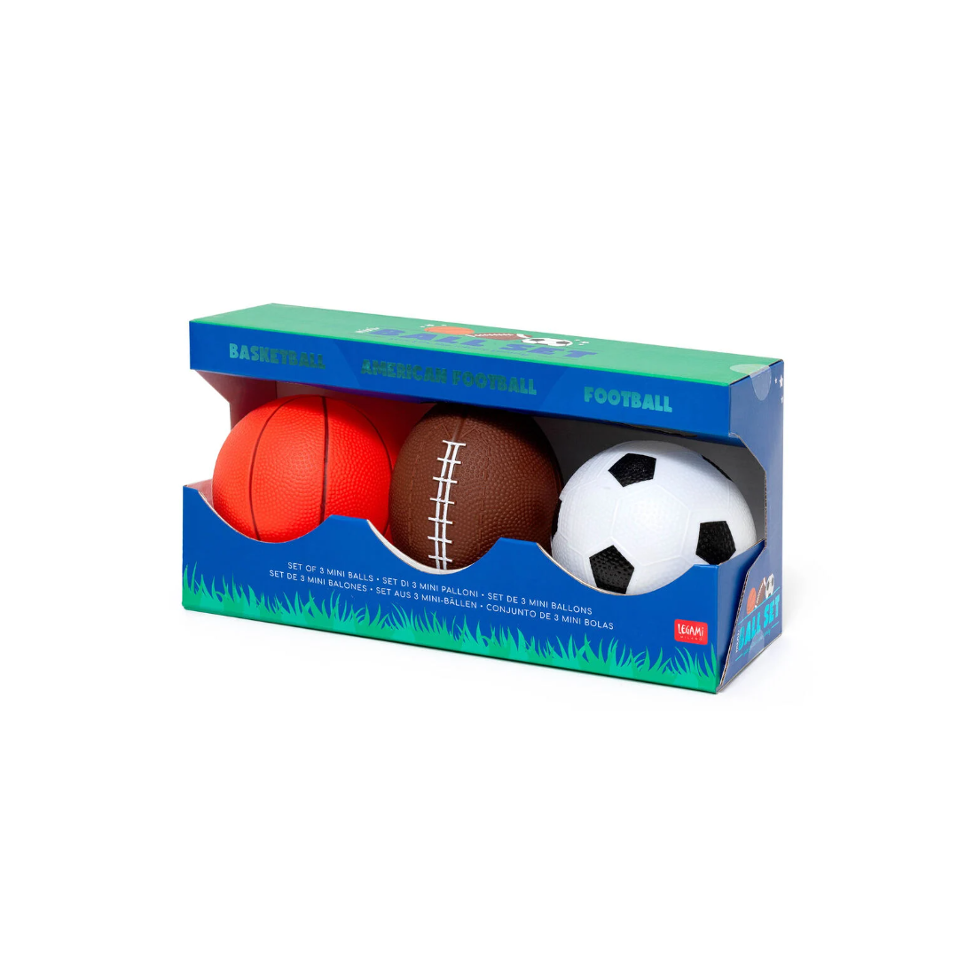 Sei pronto per diventare più veloce di Maradona, più forte di Tom Brady, più mitico di Michael Jordan? Inizia il tuo super-allenamento con il mini ball set di Legami: ogni set contiene un pallone da calcio, uno da football americano e una palla da basket, tutti in miniatura! Per chi si sente già un campione.