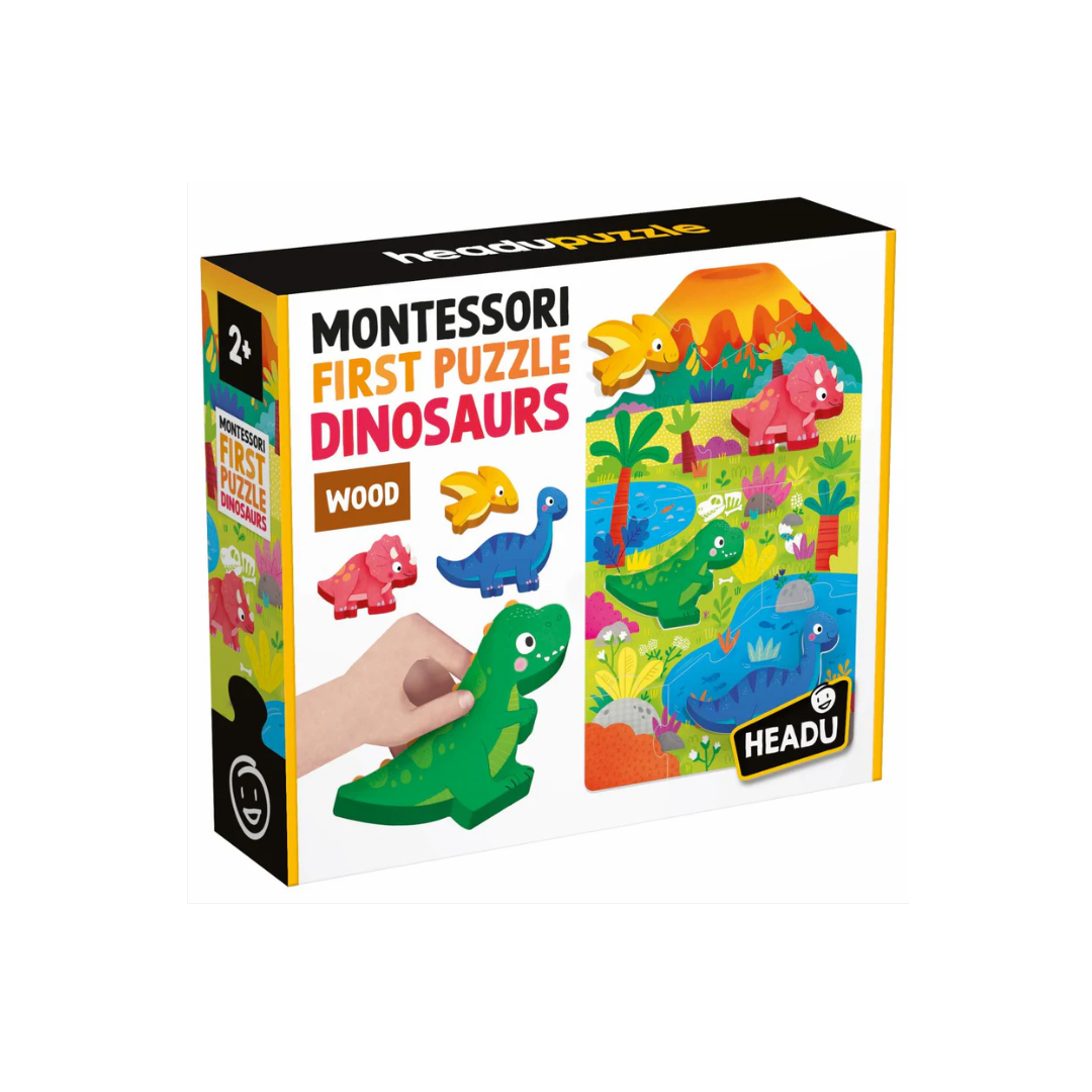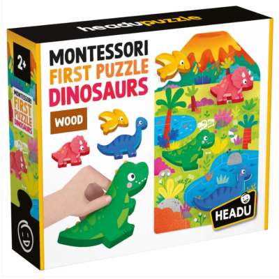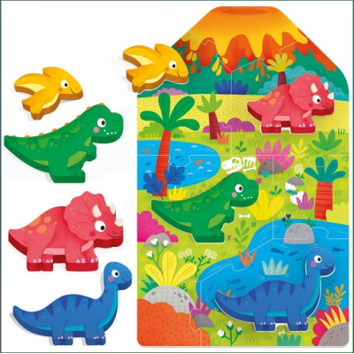 Contenuto: Puzzle sagomato di 6 pezzi; 4 dinosauri in legno