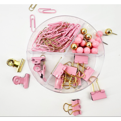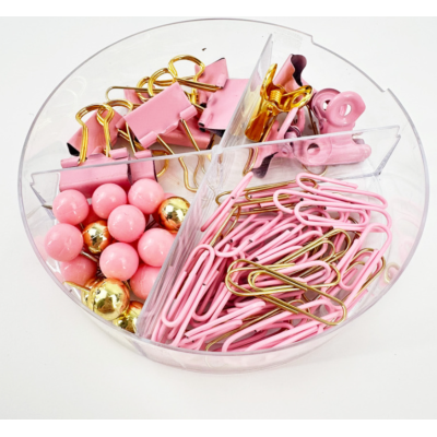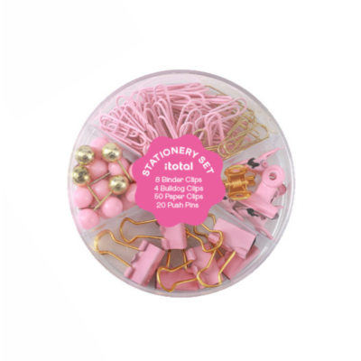 Un set completo e coordinato per aggiungere un tocco di colore e stile alla tua scrivania. Perfetto per organizzare documenti, appunti e ispirazioni in ufficio, a scuola o nel tuo angolo creativo a casa. Il contenitore rotondo trasparente è pratico e compatto, ideale anche come regalo utile e grazioso per chi ama l’ordine con un tocco glamour. Contenuto del set : 8 fermagli binder 4 clip bulldog 50 graffette classiche 20 puntine da bacheca