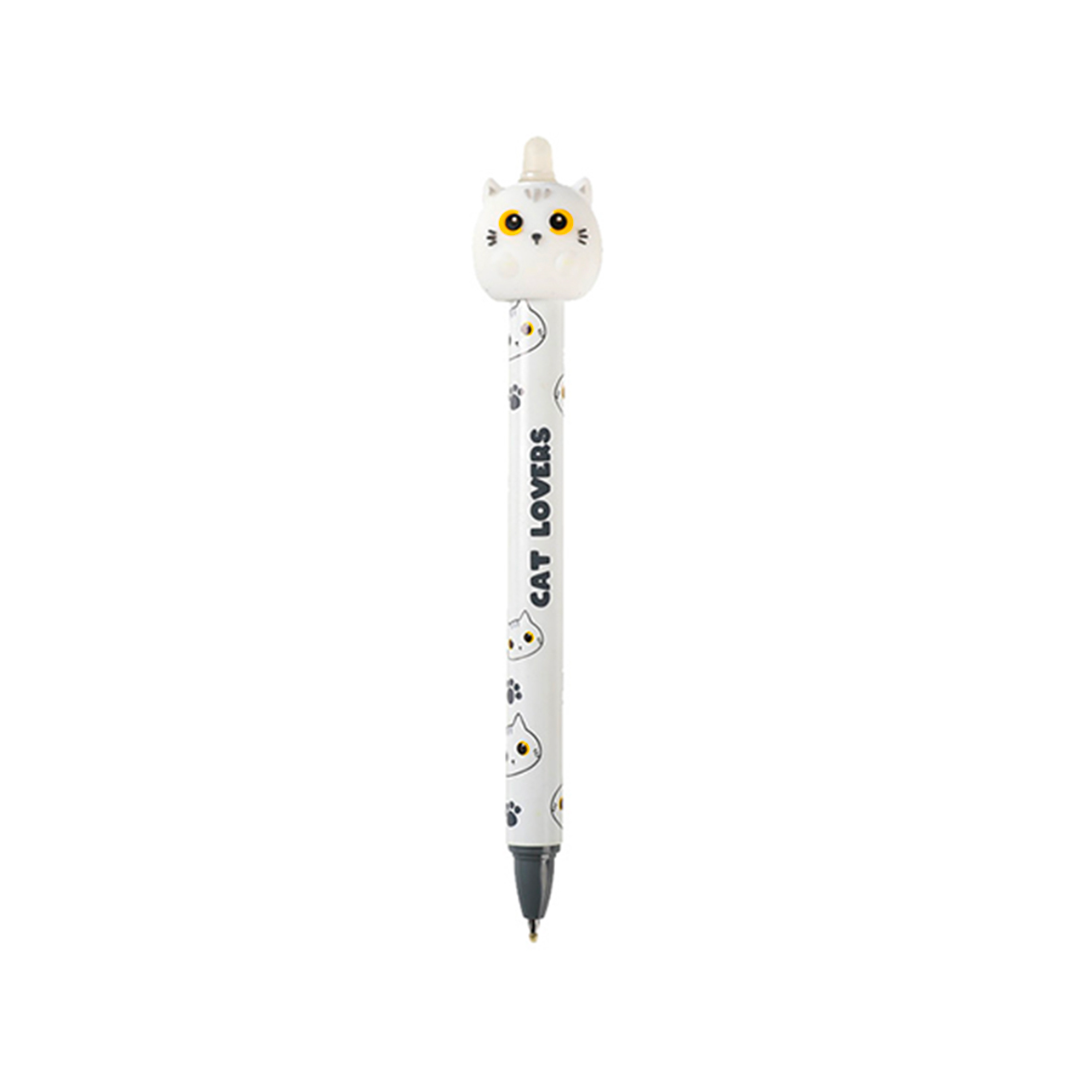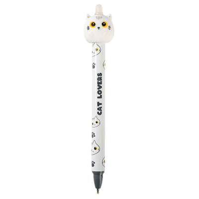 Penna cancellabile a scatto punta da 0,5 mm di colore blu, con gatto bianco 3D in stile kawaii e gomma sul retro. La penna si apre cliccando sulla testa del gatto. 16 soggetti disponibili: collezionali tutti.