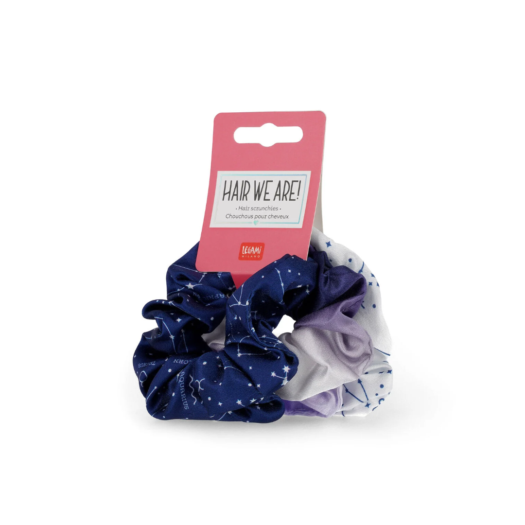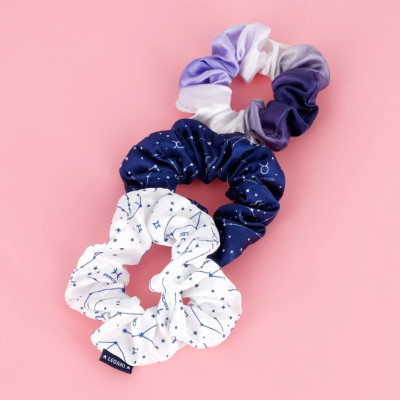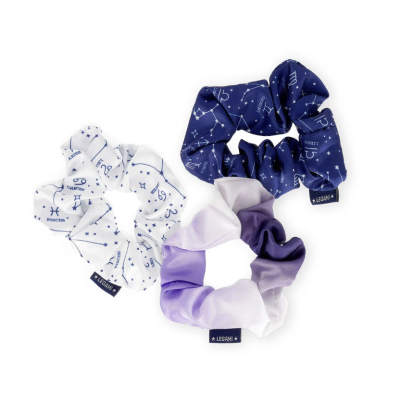 Set di 3 Elastici Fermacoda per Capelli in Tessuto Arricciato effetto satinato a tema Zodiaco. Non spezzano e non lasciano pieghe sui capelli. Usali per code di cavallo, chignon e piccoli bun: portali sempre con te