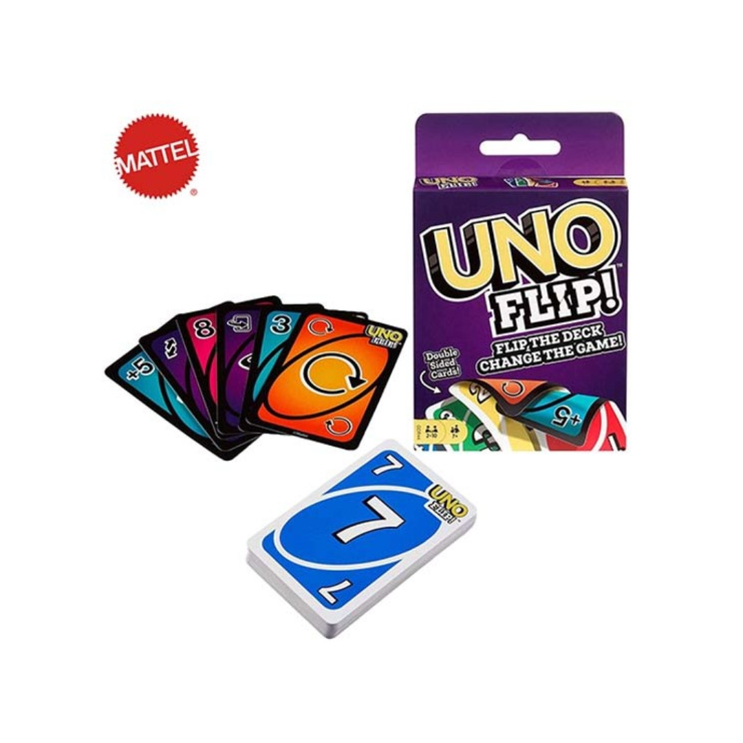 Preparatevi per la prossima iterazione del classico UNO: UNO FLIP! È il gioco di abbinamento che conoscete, con l'aggiunta di nuove entusiasmanti novità, come un mazzo a doppia faccia e una speciale carta FLIP, che conferiscono al gameplay classico un tocco di competitività. I giocatori, a turno, abbinano una carta in mano alla carta mostrata in cima al mazzo, per colore o numero. In una corsa per esaurire le proprie carte, i giocatori possono giocare carte speciali per rallentare gli avversari, come Salta, Inverti e carte Jolly che cambiano colore. UNO FLIP! include anche nuove carte Azione che cambiano davvero le carte, come Pesca Cinque e Salta Tutti. Giocate la speciale carta FLIP e tutte le carte in mano, il mazzo e il mazzo di pesca vengono girati per rivelare una serie completamente nuova di numeri e colori sul lato opposto! Il possessore della carta FLIP determina se si gioca sul lato "chiaro" o "scuro" del mazzo, e quando si cambia il lato. Elaborate una strategia per mettere in difficoltà gli avversari ed essere i primi a sbarazzarsi delle proprie carte per vincere. Quando ti rimane una sola carta, non dimenticare di gridare "UNO!". Colori e decorazioni possono variare.