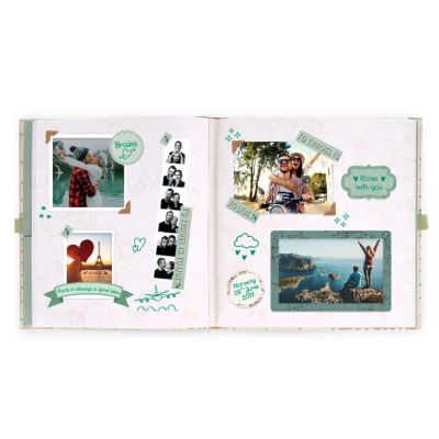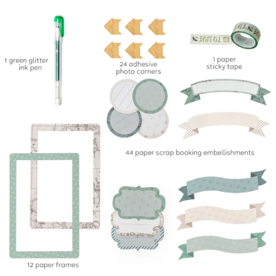 Include: 1 album con 20 pagine in carta 180g/m2 e 1 custodia contenente 1 penna con inchiostro glitter, 3 nastri adesivi in carta, 24 angoli adesivi per fissare le foto all'album, 12 cornici in carta e 44 elementi decorativi
