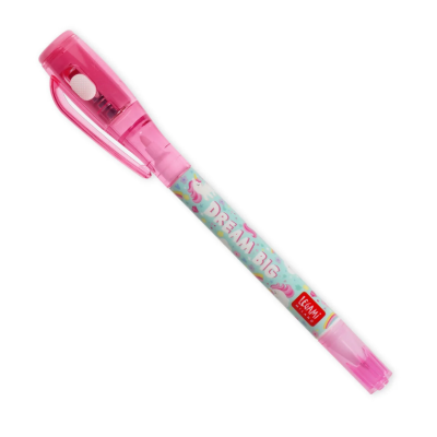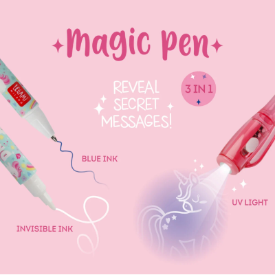 Una penna con il tocco magico! Penna a Sfera a tema Unicorno con Inchiostro Blu per tutti i giorni... e Penna con Inchiostro Invisibile dall'altra parte, per le missioni speciali. Rivela i tuoi appunti segreti solo con la Luce UV nascosta nel cappuccio.