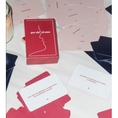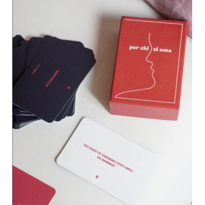 "Per chi si ama" è un gioco basato sui principi di "io sono te" progettato per rafforzare le relazioni, migliorare l'intimità, coltivare e riaccendere la connessione di coppia in conversazioni profonde e significative sull'amore, i desideri e la vita.