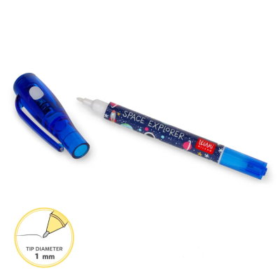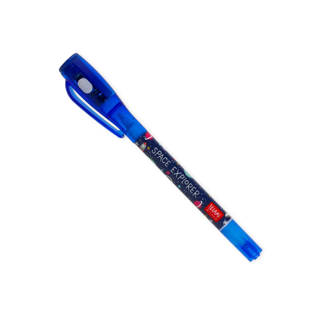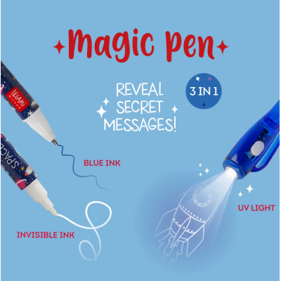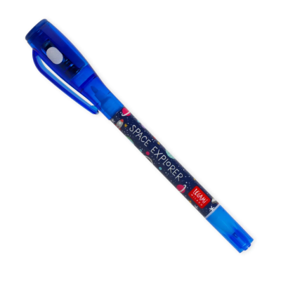Una penna davvero spaziale! Penna a Sfera a tema Spazio con Inchiostro Blu per tutti i giorni... e Penna con Inchiostro Invisibile dall'altra parte, per le missioni speciali. Rivela i tuoi appunti segreti solo con la Luce UV nascosta nel cappuccio.