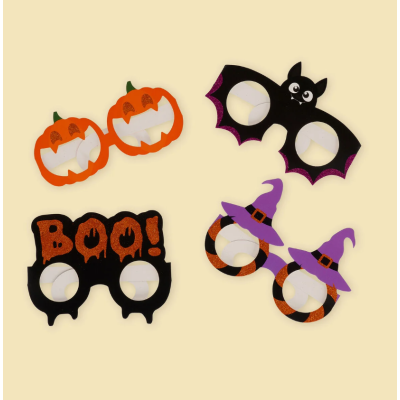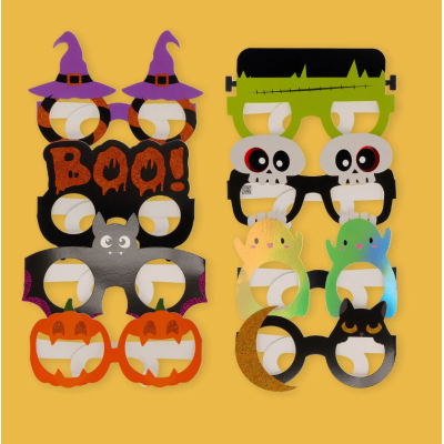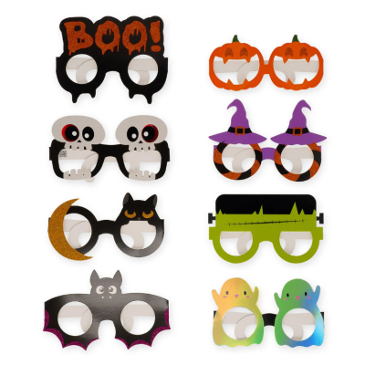 Preparati alla notte più spaventosa dell'anno con 8 Occhiali Di Carta Di Halloween. Scegli tra Boo, Zucche, Teschi, Streghe, Gatti, Mostri, Pipistrelli e Fantasmi.