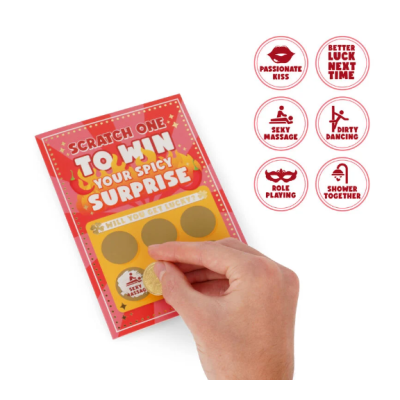 È il compleanno del tuo amore. Come non rovinare l'effetto sorpresa, quando il regalo più bello sei tu? Con il Biglietto d'Auguri Gratta e Scopri di Legami. Regalalo alla tua dolce metà; con un pizzico di fortuna potrà vincere un bacio appassionato, un massaggio sexy o un ballo proibito. E se la sorte non è dalla sua, potrai almeno concedere un premio di consolazione!