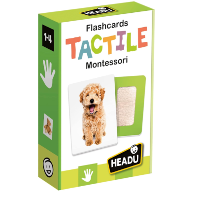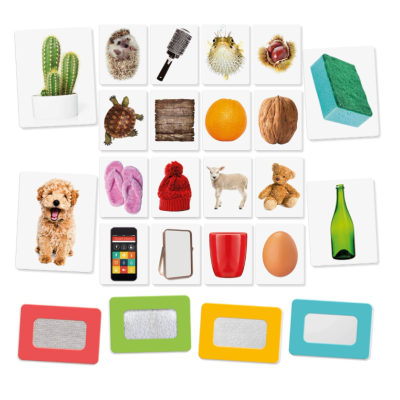 OTTIMI CONTENUTI per giocare in più modi e divertirsi imparando: 4 carte tattili, 20 carte illustrate, istruzioni.