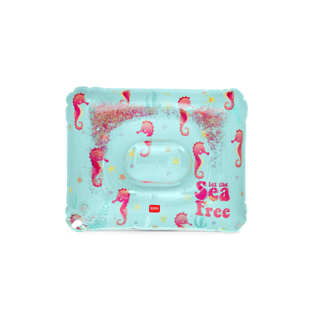 Anche tu quando vai in vacanza non sai mai dove hai la testa? Appoggiala sul morbido Cuscino Gonfiabile a tema Seahorse di Legami. Che tu sia al mare, in piscina o in campeggio, sarà sempre lì per darti sostegno e i glitter colorati al suo interno renderanno la giornata ancora più scintillante.