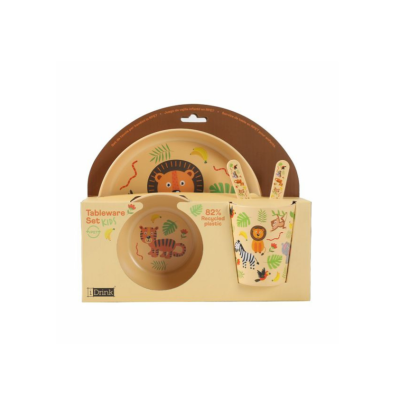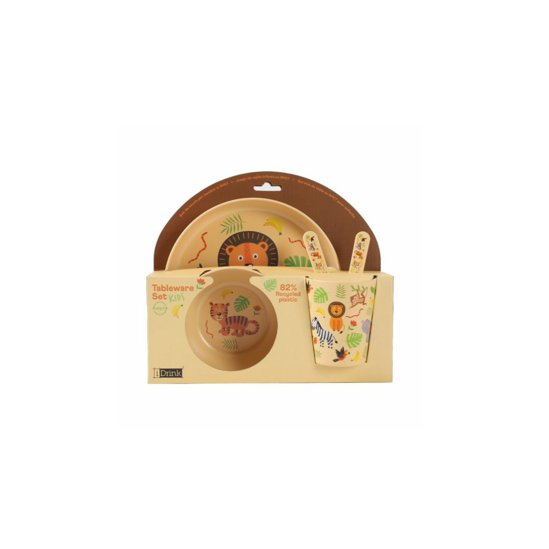 iDrink Set in RPET Kids con Bicchiere, Ciotola, Piattino e Posate ANIMALS. Ecologica e sostenibile. Priva di ftalati e BPA. Lavabile in lavastoviglie.