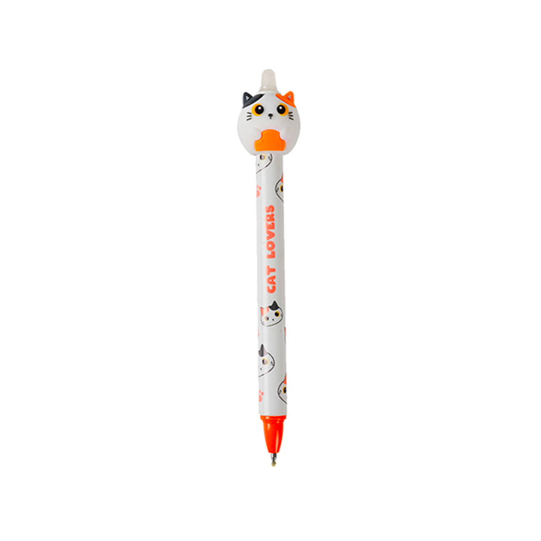 Penna cancellabile a scatto punta da 0,5 mm di colore blu, con gatto a macchie 3D in stile kawaii e gomma sul retro. La penna si apre cliccando sulla testa del gattino. 16 soggetti disponibili: collezionali tutti.