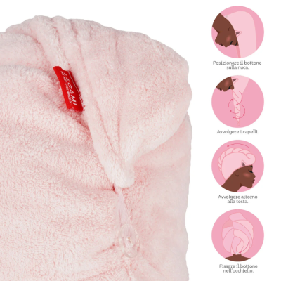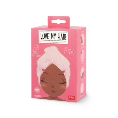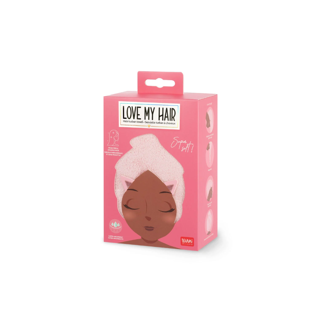 Addio capelli crespi! Bye bye ore di asciugacapelli! Au revoir punte spezzate! A prendersi cura dei capelli appena lavati arriva l’Asciugamano per Capelli a Turbante - Love My Hair di Legami. Questo morbido Kitty in microfibra super assorbente avvolge la chioma in 4 semplici mosse e si fissa con un semplice bottone.