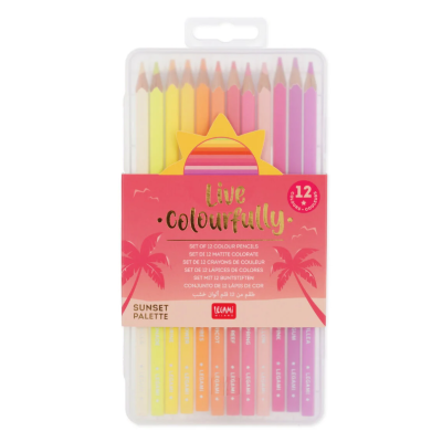 Immagina di essere su una meravigliosa spiaggia, lo sguardo verso l’orizzonte. Davanti a te un tramonto infuocato, con tutte le sfumature del giallo, dell’arancio, del rosa... Ora apri gli occhi. Oh, no! Sei di nuovo al tuo banco di scuola?Poco male, puoi creare i tuoi tramonti personali con il Set di 12 Matite Colorate Live Colorfully nella Sunset Palette di Legami.Tu pensa ai tuoi disegni, che al resto pensano loro: la mina è morbida, ma resistente; la forma è adatta a mancini e destrimani;