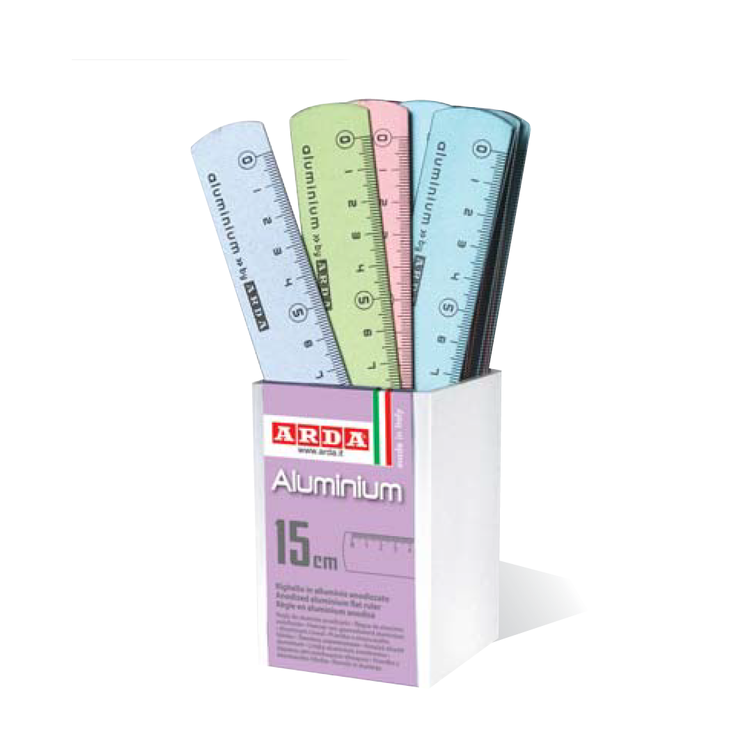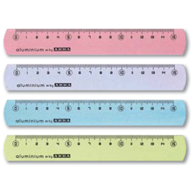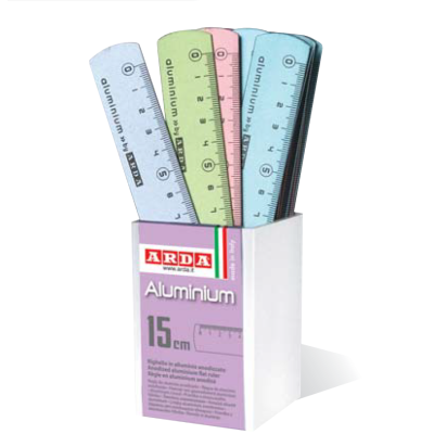 Righelli in alluminio. La speciale finitura ''Frost'' dona un aspetto elegante e moderno. La millimetrazione con cifre in evidenza ogni 5 cm facilita la lettura, rendendoli ideali per ogni progetto creativo. Disponibile in 4 colori vivaci. Lunghezza 15 cm.