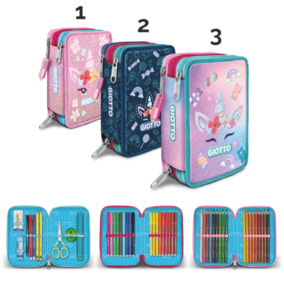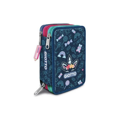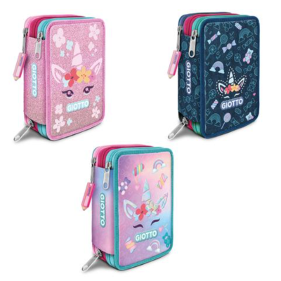 ASTUCCI 3 ZIP CON CORREDO PREMIUM CANDY - GIOTTO CANDY COLLECTION: UNA COLLEZIONE SUPER TRENDY A TEMA CARAMELLE CON UN SIMPATICO UNICORNO, EROE DELLA COMUNICAZIONE. ASTUCCI A TRE SCOMPARTI CON TUTTO QUELLO CHE SERVE PER LA SCUOLA POLIESTERE 900D IMPERMEABILI E CON CERNIERE IN METALLO ASSORTITO IN 3 MODELLI: ROSA (CON TESSUTO EFFETTO GLITTER), JEANS (CON TESSUTO JEANS E DETTAGLI GLITTER) E ARCOBALENO (CON TESSUTO EFFETTO IRIDESCENTE)V CON OGNI ASTUCCIO UN CHARM MATITA IN GOMMA, PERSONALIZZABILE