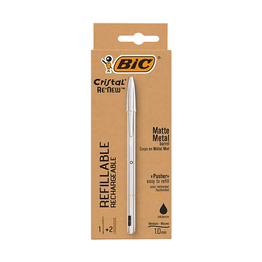 Sostenibile, la penna Cristal Re’New è facilmente ricaricabile tramite un pratico pulsante per sostituire i refill ed è dotata di cappuccio in plastica riciclata al 96%. Ogni confezione contiene 1 penna + 2 refill per un totale di più di 6 km di scrittura.