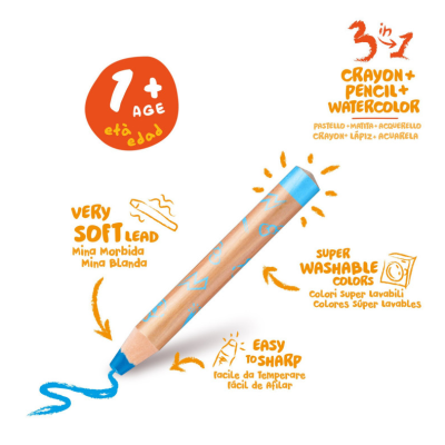 • Scatola 10 pastelloni BABY 1+ 3in1, matita, cera e acquerello in un unico pastello • Corpo extra large Ø 10 mm, facile da impugnare • Acquerellabili se mescolati con acqua e pennello • Temperino incluso nella confezione • Colori brillanti e lavabili Per bambini al di sotto dei 3 anni si consiglia la sorveglianza da parte di un adulto. Il temperino deve essere utilizzato da parte di un adulto.Leggere e conservare le avvertenze.