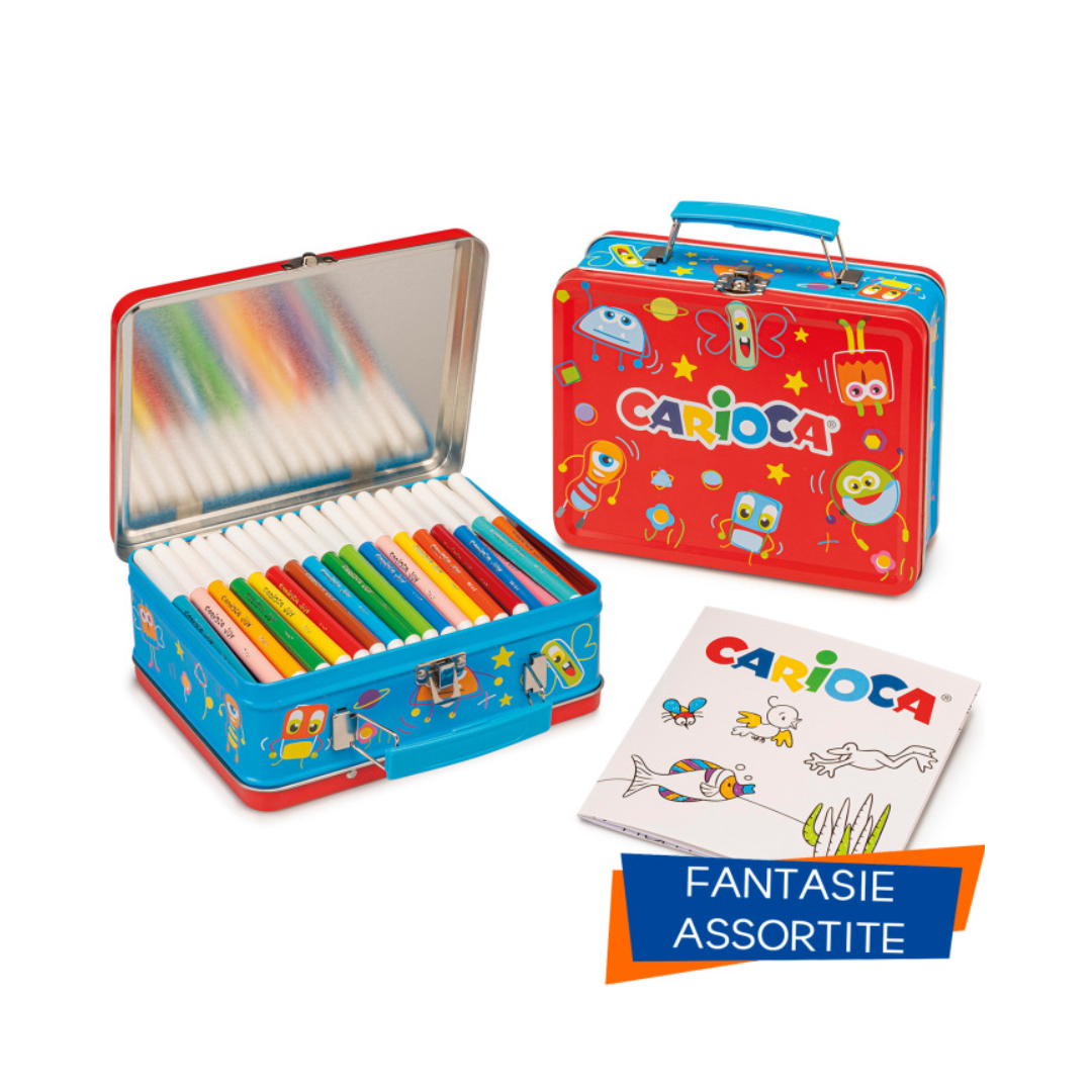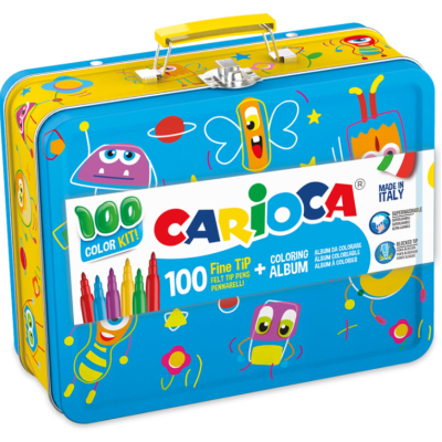 • Scatola in latta CARIOCA® con: • 100 Pennarelli punta fine e inchiostro superlavabile • 1 Album da colorare • Dedicata ai piccoli artisti, che non vogliono mai rimanere a corto di pennarelli e di idee