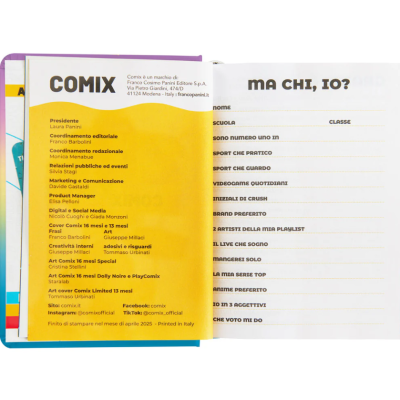 DIARIO COMIX 16 MESI: questa diario Comix 16 mesi, da settembre 2025 a dicembre 2026, è ideale per le scuole medie e superiori. TASCABILE: grazie alle dimensioni ridotte (11x15.3h cm) è comodo da portare sempre con te, per prendere appunti e pianificare le tue giornate scolastiche. MATERIALE DI QUALITÀ: realizzato con materiali resistenti e durevoli, per durare tutto l'anno scolastico.